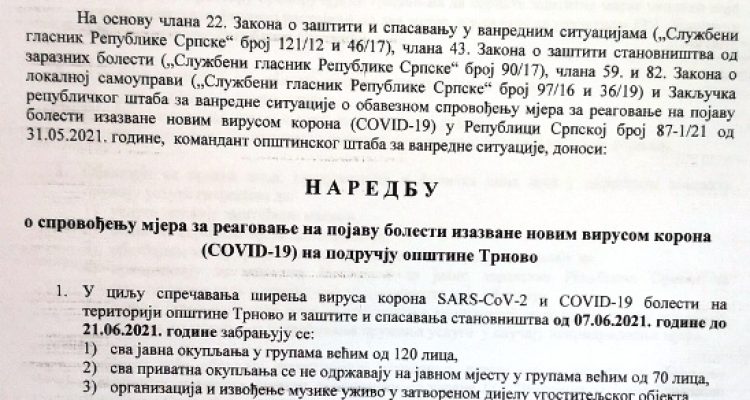 Mira Opština Trnovo јун 4, 2021 0 Коментара Наредба о спровођењу мјера за реаговање на појаву болести изазване вирусом корона до 21.06.
