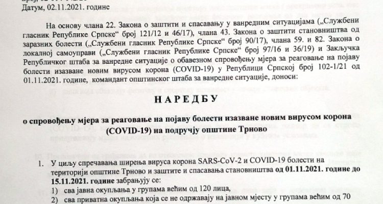 Наредба о спровођењу мјера за реаговање на појаву болести изазване вирусом корона до 15.11.