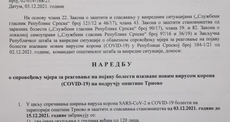 Mira Opština Trnovo децембар 3, 2021 0 Коментара Наредба о спровођењу мјера за реаговање на појаву болести изазване вирусом корона – (до 15.децембра)