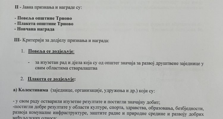 Mira Opština Trnovo април 24, 2026 0 Коментара KOHКУРС ЗА ДОДЈЕЛУ ЈАВНИХ ПРИЗНАЊА И НАГРАДА ОПШТИНЕ ТРНОВО