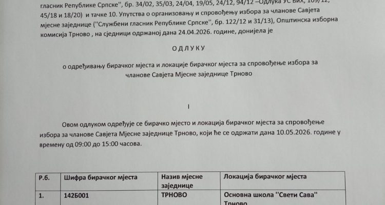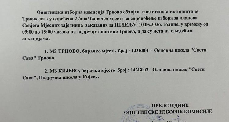 Mira Opština Trnovo април 8, 2026 0 Коментара ЈАВНИ ПОЗИВ ЗА ПРИЈАВУ СТРУЧНИХ ПРАВНИХ И ФИЗИЧКИХ ЛИЦА ЗА ПОСЛОВЕ ТЕХНИЧКОГ ПРЕГЛЕДА ОБЈЕКАТА