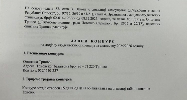 Mira Opština Trnovo децембар 16, 2025 0 Коментара КОНКУРС ЗА ДОДЈЕЛУ СТУДЕНТСКИХ СТИПЕНДИЈА ЗА АКАДЕМСКУ 2025/2026 ГОДИНУ