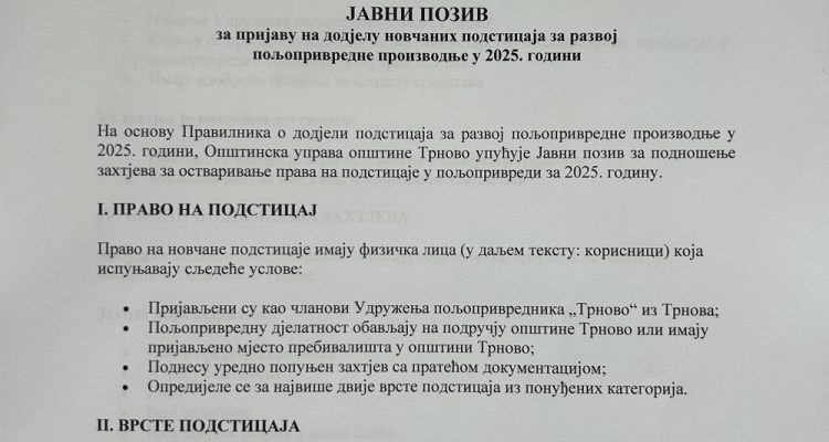 ЈАВНИ ПОЗИВ ЗА ПОДСТИЦАЈ У ПОЉОПРИВРЕДИ У 2025.ГОД.
