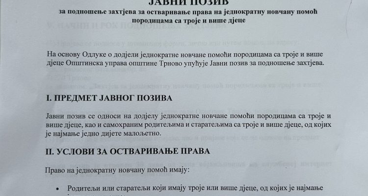 ЈАВНИ ПОЗИВ ЗА ПОМОЋ ПОРОДИЦАМА СА ТРОЈЕ ИЛИ ВИШЕ ДЈЕЦЕ