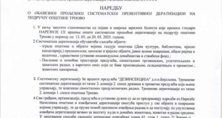 НАРЕДБА О СИСТЕМАТСКОЈ ДЕРАТИЗАЦИЈИ