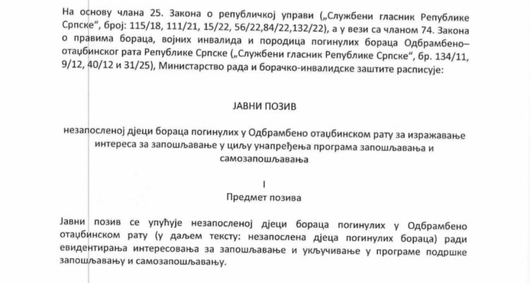 • ЈАВНИ ПОЗИВ НЕЗАПОСЛЕНОЈ ДЈЕЦИ ПОГИНУЛИХ БОРАЦА