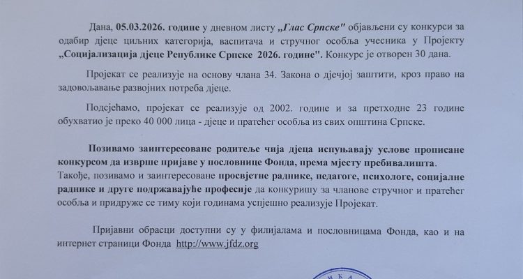 Mira Opština Trnovo март 11, 2026 0 Коментара ОБАВЈЕШТЕЊЕ О ПРОЈЕКТУ „СОЦИЈАЛИЗАЦИЈА ДЈЕЦЕ РЕПУБЛИКЕ СРПСКЕ 2026. ГОДИНЕ“