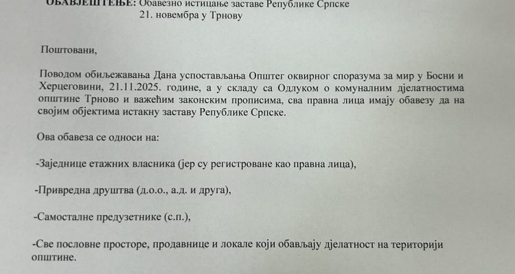 Mira Opština Trnovo новембар 19, 2025 0 Коментара Обавезно истицање заставе Републике Српске 21. новембра у Трнову