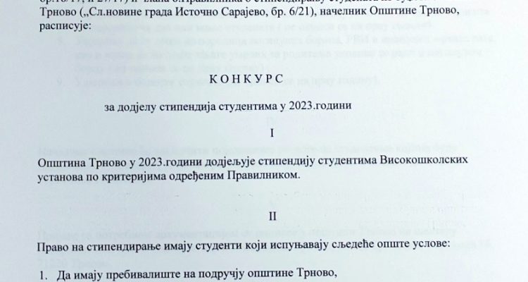 Mira Opština Trnovo децембар 7, 2022 0 Коментара Конкурс за додјелу студентских стипендија у 2023.години