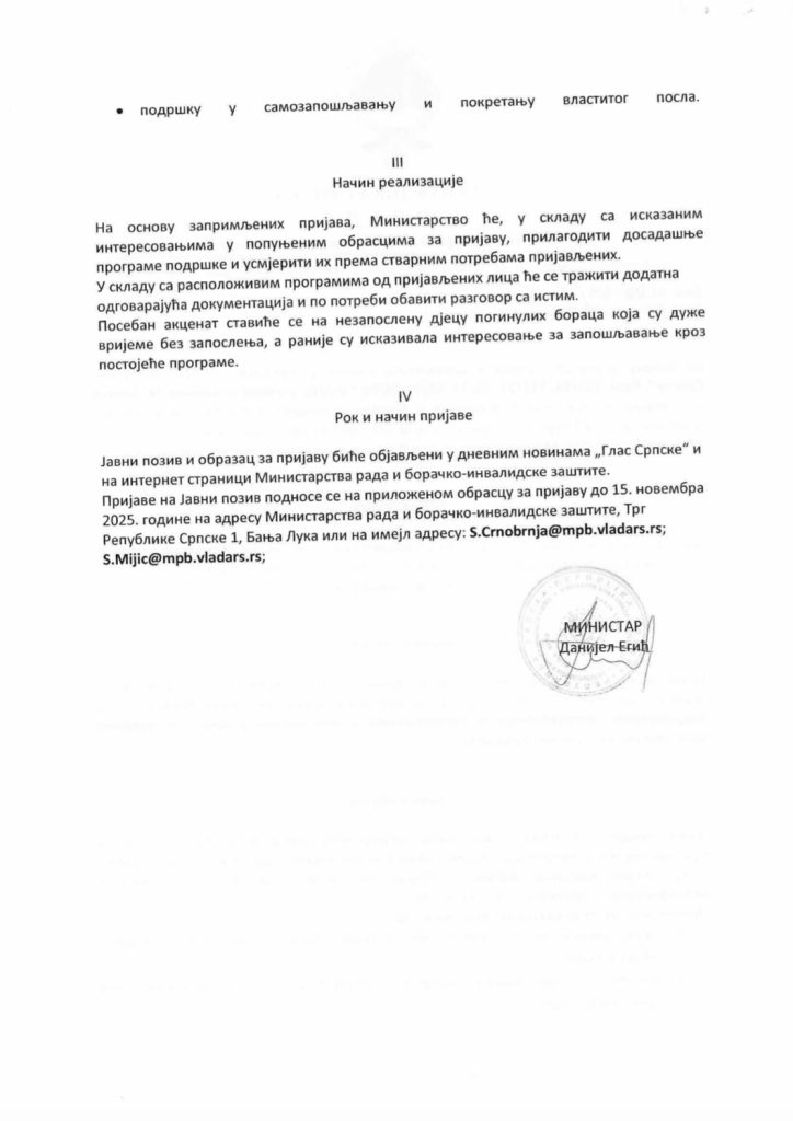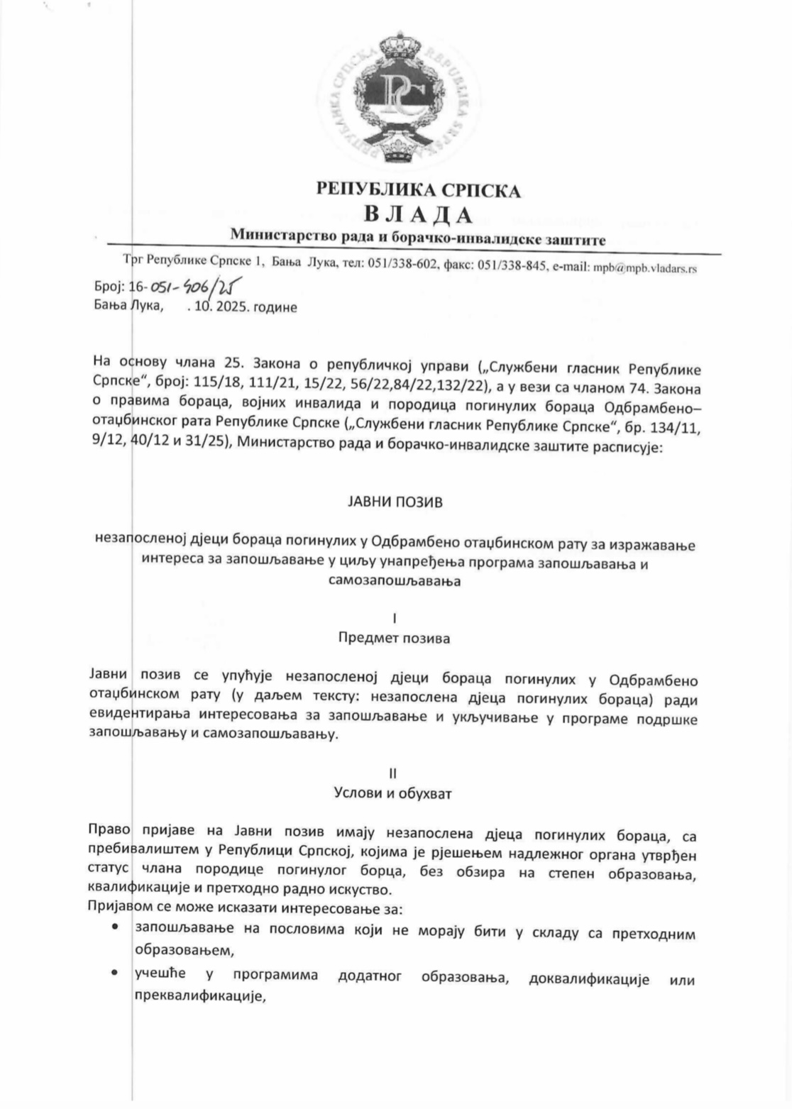 ЈАВНИ ПОЗИВ НЕЗАПОСЛЕНОЈ ДЈЕЦИ ПОГИНУЛИХ БОРАЦА