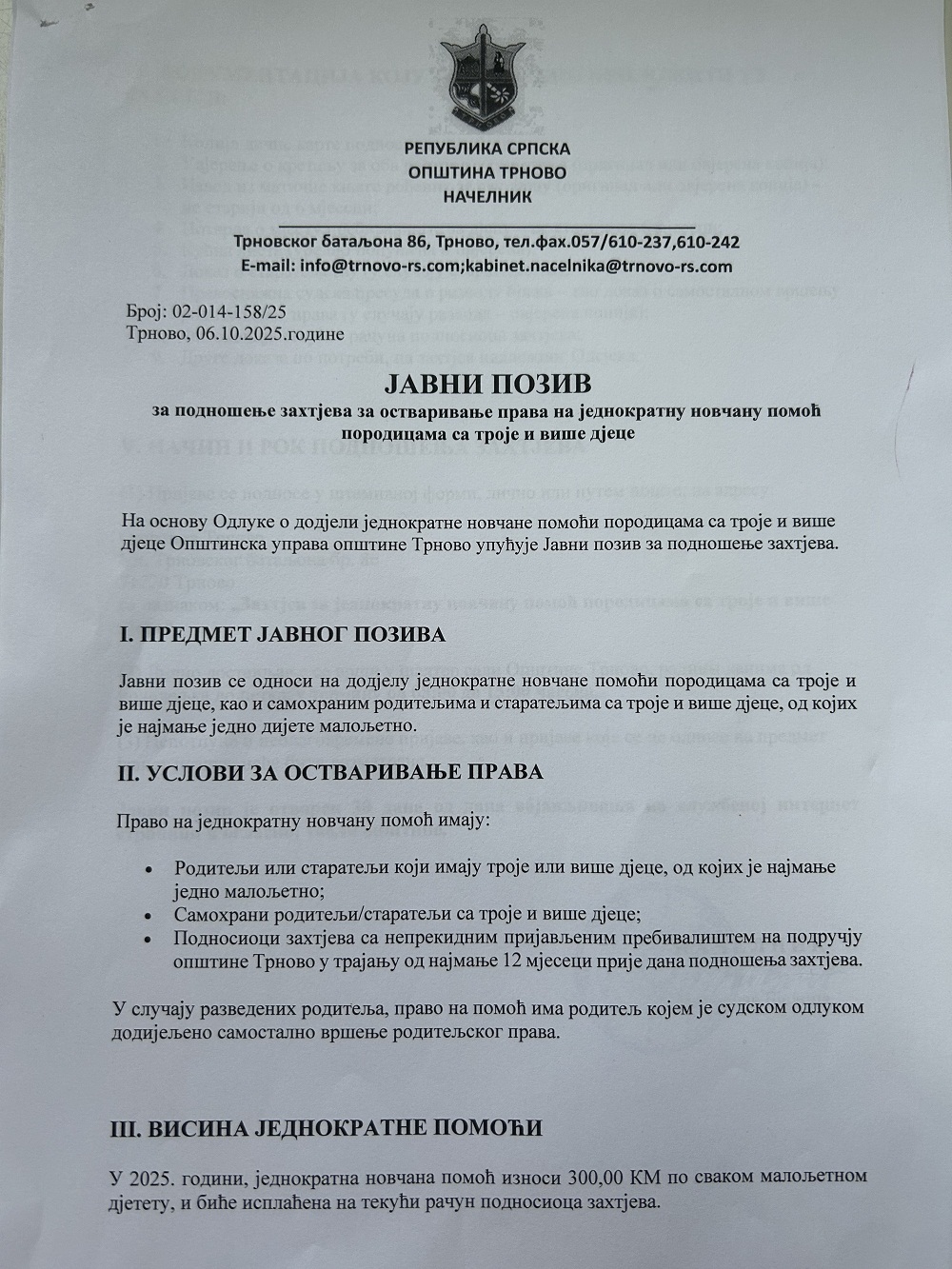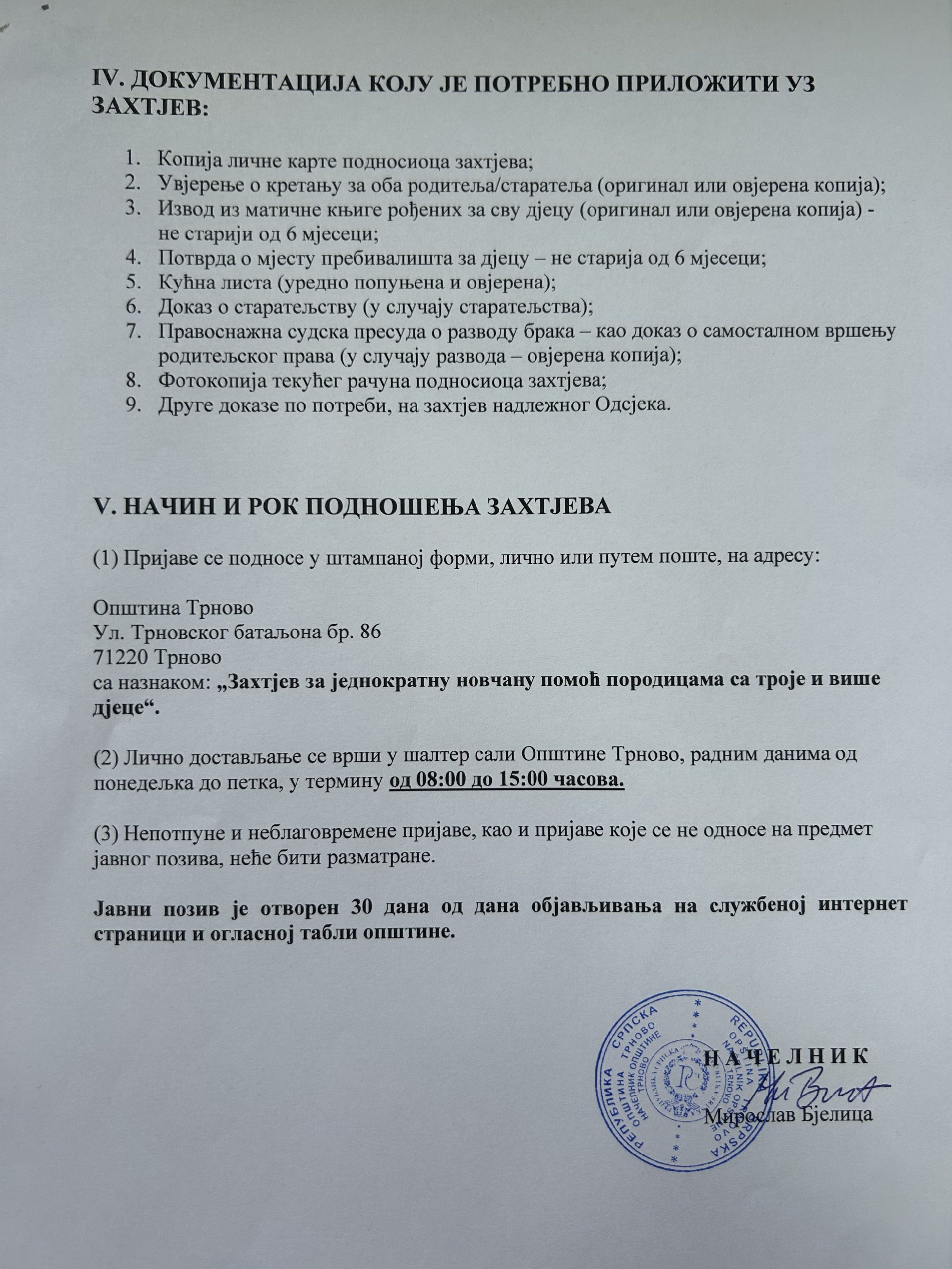 ЈАВНИ ПОЗИВ ЗА ПОМОЋ ПОРОДИЦАМА СА ТРОЈЕ ИЛИ ВИШЕ ДЈЕЦЕ