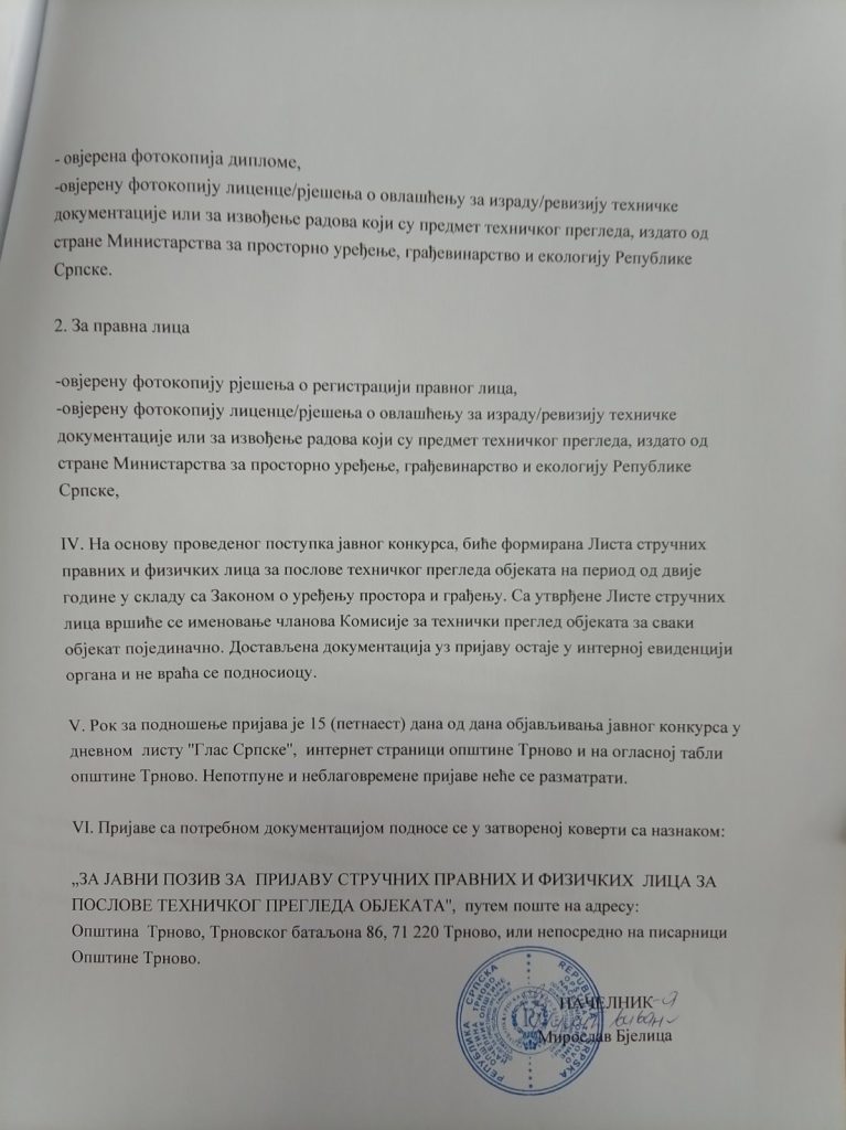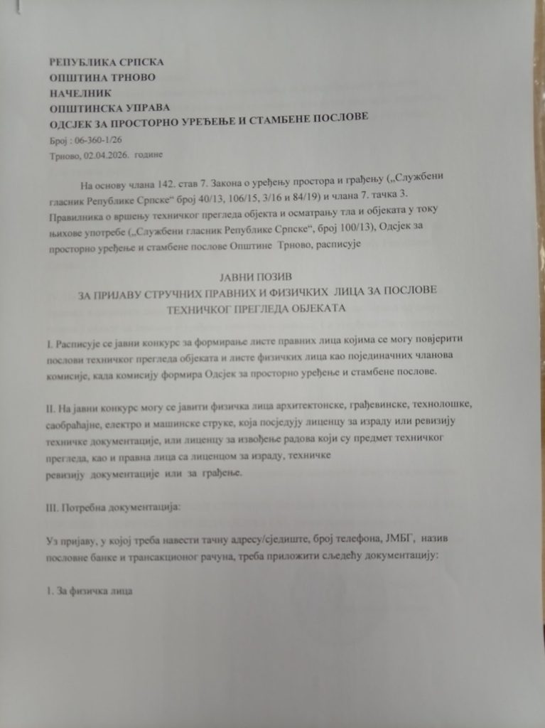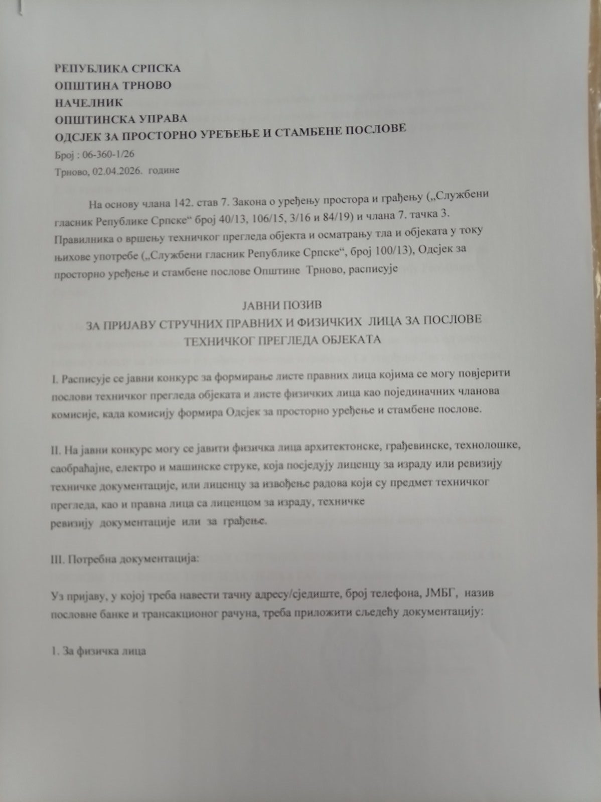 ЈАВНИ ПОЗИВ ЗА ПРИЈАВУ СТРУЧНИХ ПРАВНИХ И ФИЗИЧКИХ ЛИЦА ЗА ПОСЛОВЕ ТЕХНИЧКОГ ПРЕГЛЕДА ОБЈЕКАТА