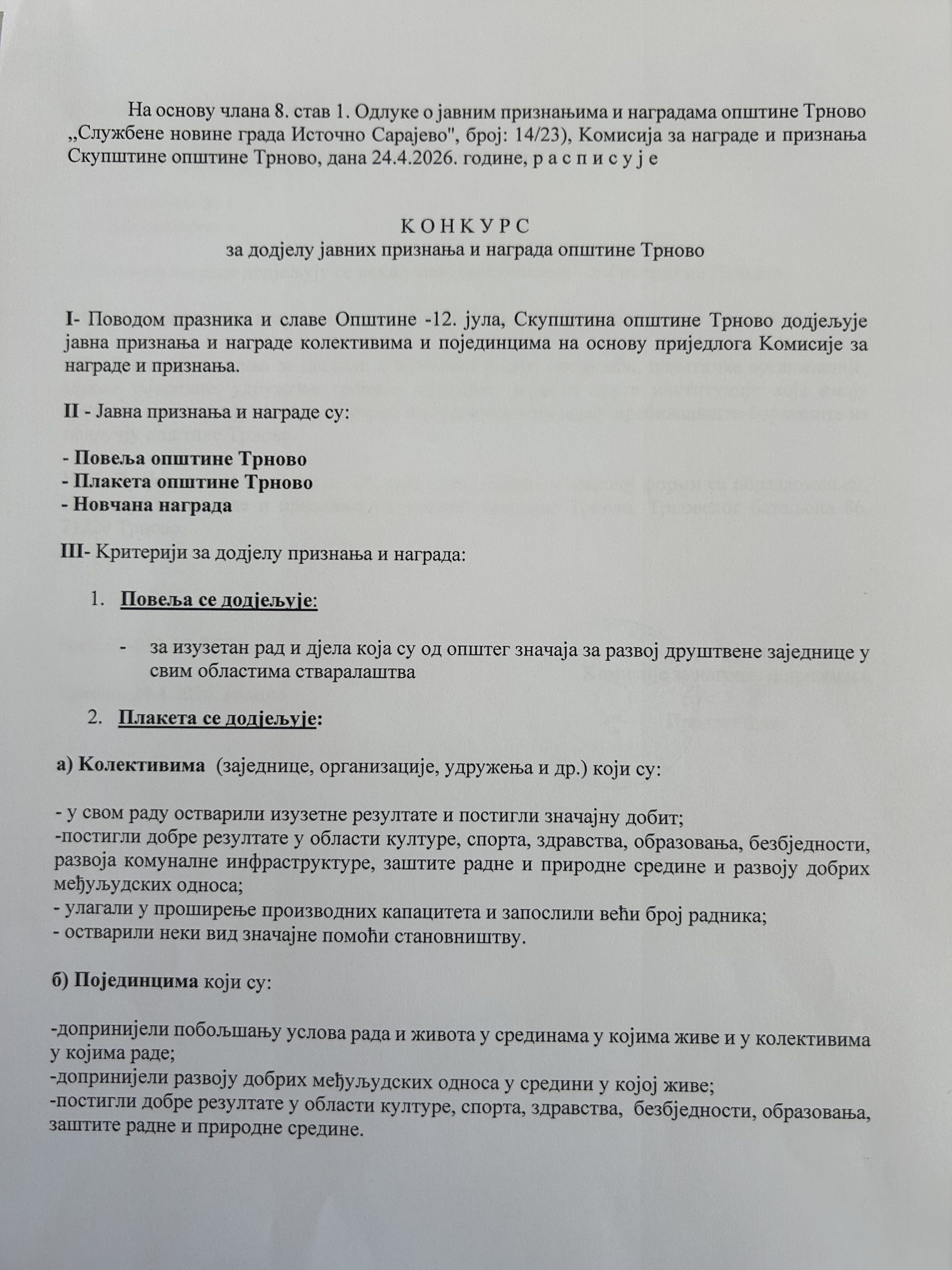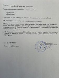 Mira Opština Trnovo април 24, 2026 0 Коментара KOHКУРС ЗА ДОДЈЕЛУ ЈАВНИХ ПРИЗНАЊА И НАГРАДА ОПШТИНЕ ТРНОВО Scan1 Scan2 Подијели facebook twitter Кретање чланка Претходни ОБРАСЦИ ЗА ИЗБОРЕ САВЈЕТА МЈЕСНИХ ЗАЈЕДНИЦА 0 0 гласови Гласање за чланке Претплати се Пријави се Обавести о новим коментарима новим одговорима на моје коментаре Label {} [+] Име* Е-пошта* Веб место Label {} [+] Име* Е-пошта* Веб место 0 Коментари Најстарије Најновије Највише гласова Уграђене повратне информације Погледај све коментаре
