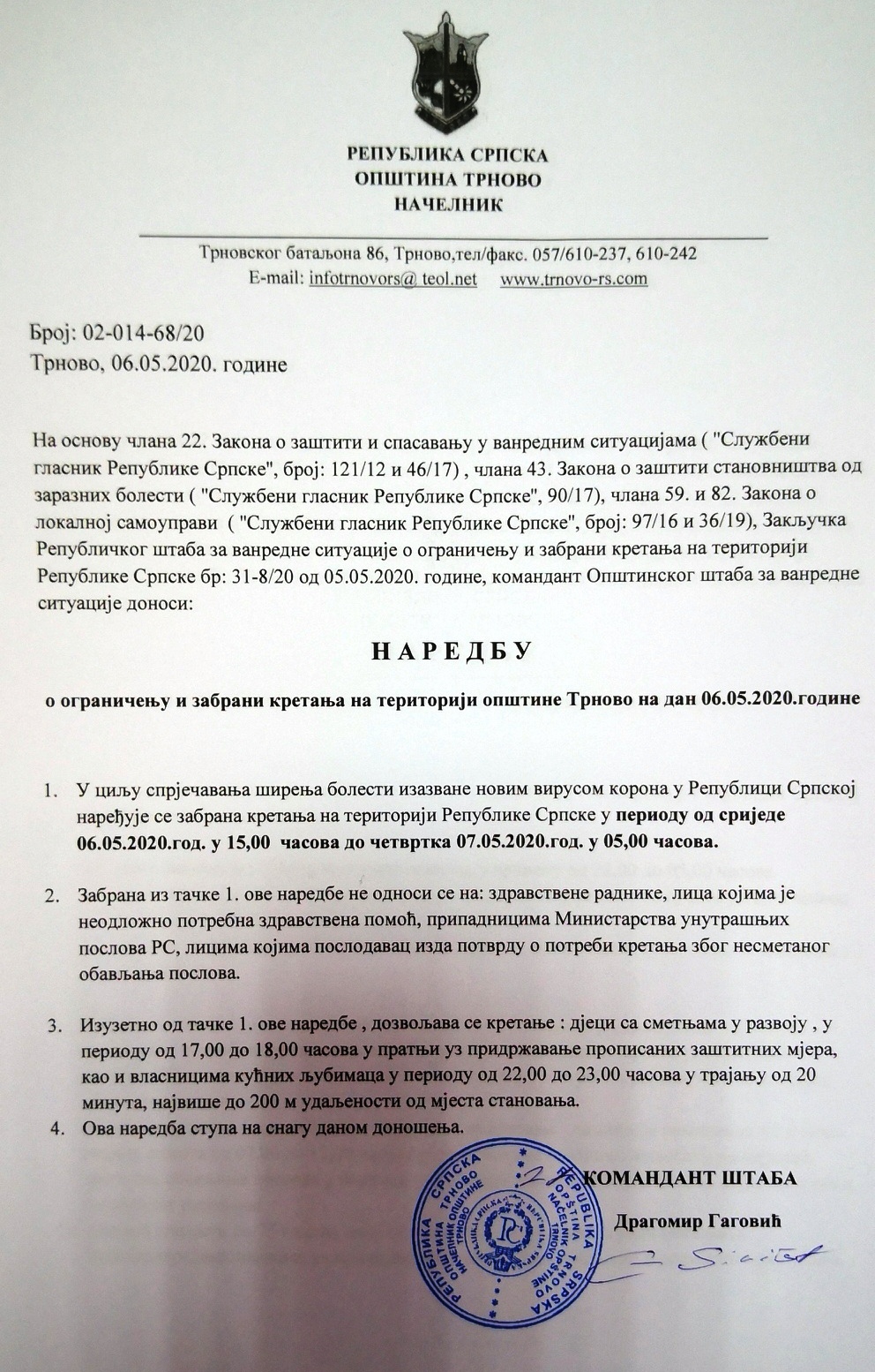 admin мај 6, 2020 0 Коментара Наредба о ограничењу и забрани кретања на територији општине Трново на дан 06.05.2020.год. Подијели facebook twitter Кретање чланка Претходни Ограничење и забрана кретања у дане првомајских празника Сљедећи Наредба о ограничењу и забрани кретања на територији општине Трново