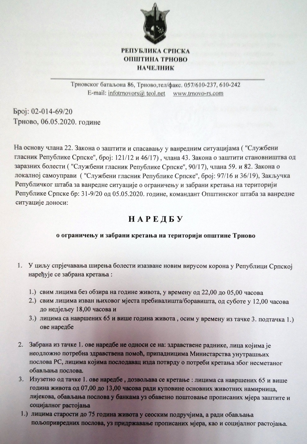 admin мај 6, 2020 0 Коментара Наредба о ограничењу и забрани кретања на територији општине Трново Подијели facebook twitter Кретање чланка Претходни Наредба о ограничењу и забрани кретања на територији општине Трново на дан 06.05.2020.год. Сљедећи Наредба о обавезном спровођењу мјера за реаговање на појаву болести изазване вирусом корона на територији општине Трново