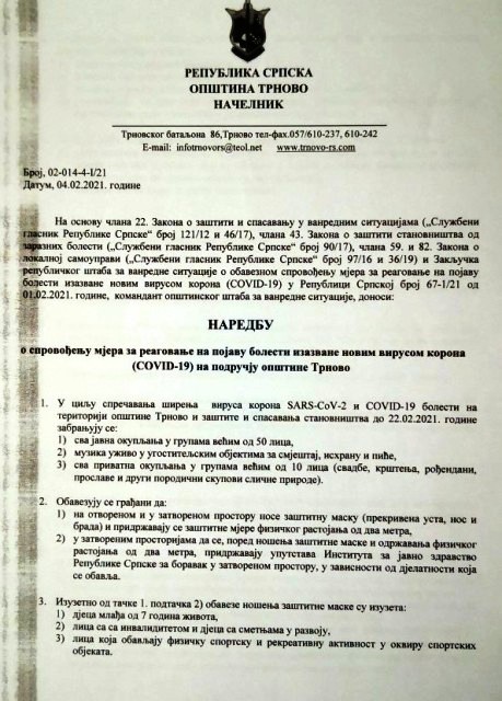 Mira Opština Trnovo фебруар 4, 2021 0 Коментара Наредба о провођењу мјера (COVID -19) на подручју општине Трново наредба наредба стр Подијели facebook twitter Кретање чланка Претходни Одржан састанак у вези друге фазе пројекта „Јачање улоге мјесних заједница у БиХ“ Сљедећи ОБАВЈЕШТЕЊЕ ВИК-а ЗА ПОТРОШАЧЕ СА ПОДРУЧЈА КИЈЕВА И ТРНОВА
