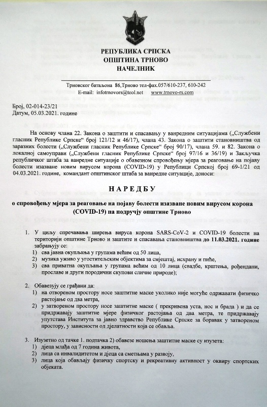 Mira Opština Trnovo март 5, 2021 0 Коментара Наредба о спровођењу мјера за реаговање на појаву болести изазване вирусом корона Подијели facebook twitter Кретање чланка Претходни Честитка поводом уласка у Прву футсал лигу Р. Српске Сљедећи Срећан 8.март