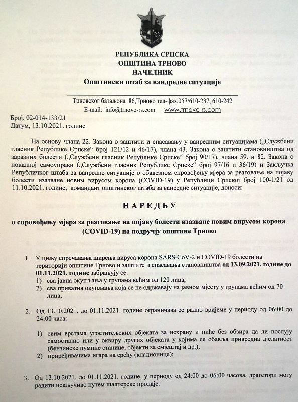 Mira Opština Trnovo октобар 13, 2021 0 Коментара Наредба о спровођењу мјера за реаговање на појаву болести изазване вирусом корона до 01.11. Подијели facebook twitter Кретање чланка Претходни Обавјештење грађанима Сљедећи АПЕЛ ГРАЂАНИМА