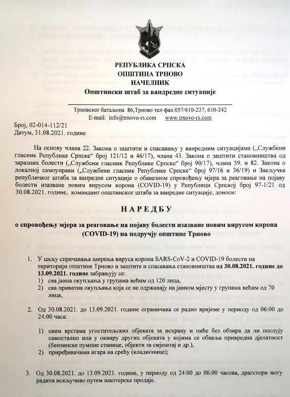 Mira Opština Trnovo septembar 1, 2021 0 Komentara Naredba o sprovođenju mjera za reagovanje na pojavu bolesti izazvane virusom korona do 13.09. Podijeli facebook twitter Kretanje članka Prethodni Prvačiće pozdravio načelnik opštine Sljedeći Obavještenje o Izmjeni dijela izmjene Revizije Regulacionog plana “Sportsko-rekreacionog područja Jahorina na području opštine Trnovo“ na inicijativu investitora “LEGEND“ d.o.o. Istočna Ilidža