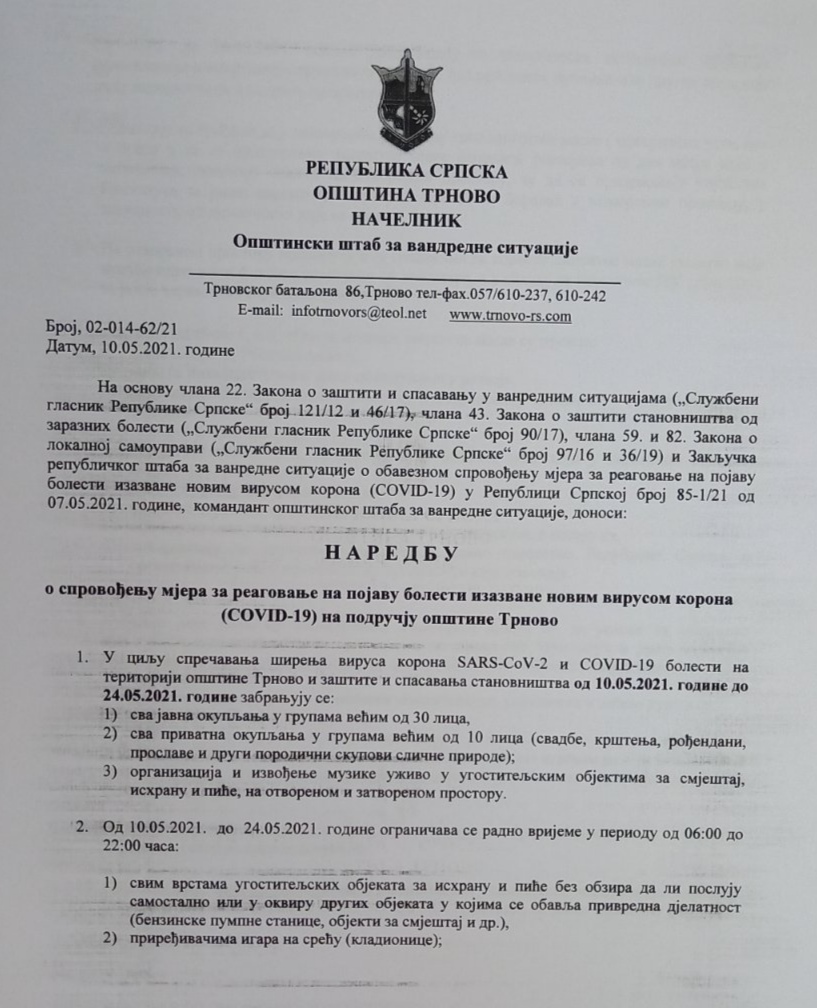 Mira Opština Trnovo мај 10, 2021 0 Коментара Наредба о спровођењу мјера за реаговање на појаву болести изазване вирусом корона до24.05. Подијели facebook twitter Кретање чланка Претходни Обавјештење о јавном увиду у Нацрт Измјене дијела Ревизије Регулационог плана “Спортско-рекреационог подручја Јахорина на подручју општине Трново“ Сљедећи Честитка поводом Рамазанског бајрама