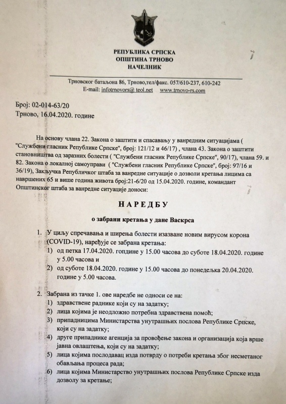 admin април 16, 2020 0 Коментара Наредба о забрани кретања у дане Васкрса Подијели facebook twitter Кретање чланка Претходни Наредба о дозволи кретања лицима са навршених 65 и више година живота Сљедећи ХРИСТОС ВОСКРЕСЕ, ВАИСТИНУ ВОСКРЕСЕ!!!!