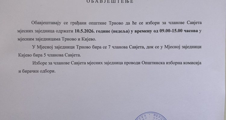 Mira Opština Trnovo februar 23, 2026 0 Komentara OBAVJEŠTENJE ZA IZBORE ČLANOVA SAVJETA MJESNIH ZAJEDNICA