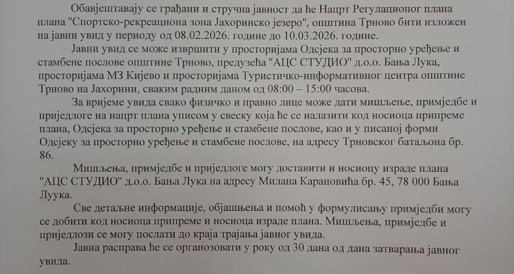 Mira Opština Trnovo februar 23, 2026 0 Komentara DRUGO OBAVJEŠTENJE ZA JAVNOST O IZLAGANJU NACRTA PLANA NA JAVNI UVID