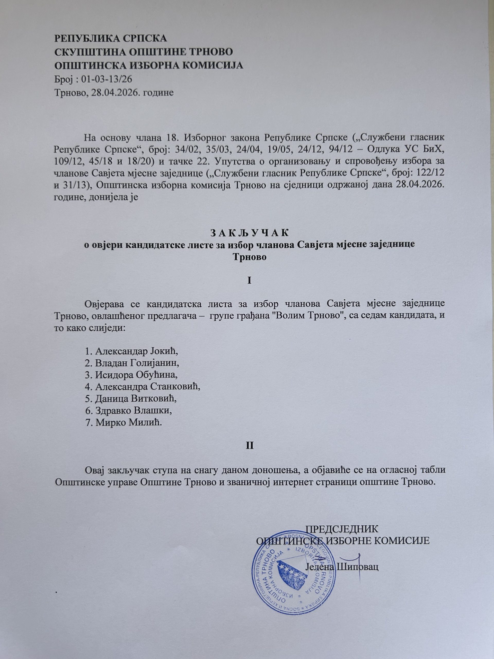 ЗАКЉУЧАК О ОВЈЕРИ КАНДИДАТСКЕ ЛИСТЕ ЗА ИЗБОР ЧЛАНОВА САВЈЕТА МЈЕСНЕ ЗАЈЕДНИЦЕ ТРНОВО